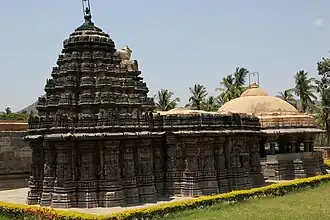 The outer wall of the vestibule shares the same decoration as the outer wall of the shrine, but is inconspicuous because it forms a short continuation between the wall of the shrine and that of closed mantapa.[8] The outer wall of the shrine is stellate, but the star points are not identical, rather they form three different kinds of star points, making the design complicated and unusual.[9] The lower half of the outer wall of the shrine and the outer wall of the closed mantapa share the same architectural articulation. The open hall, with its 16-pointed star plan is unusual. The central ceiling in the closed mantapa and the vestibule are decorated elaborately.[9]