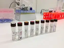 The most common isobaric tags are amine-reactive tags.[1] However, tags that react with cysteine residues and carbonyl groups have also been described.[2] These amine-reactive groups go through N-hydroxysuccinimide (NHS) reactions, which are based around three types of functional groups.[2] Isobaric labeling methods include tandem mass tags (TMT), isobaric tags for relative and absolute quantification (iTRAQ), mass differential tags for absolute and relative quantification, and dimethyl labeling.[1] TMTs and iTRAQ methods are most common and developed of these methods.[1] Tandem mass tags have a mass reporter region, a cleavable linker region, a mass normalization region, and a protein reactive group and have the same total mass.[3]