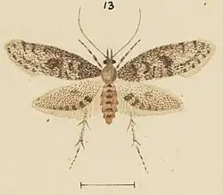 ♀︎. 12 mm. Head brownish, sides of crown sprinkled with whitish. Palpi brownish sprinkled with dark fuscous, towards base beneath and on upper edge sprinkled with whitish. Thorax brownish. Abdomen rather dark fuscous, mixed laterally with white and on edges of two basal segments. Forewings elongate, not dilated posteriorly, costa gently arched, apex obtuse, termen very obliquely rounded; white-brownish, irregularly and coarsely sprinkled with dark fuscous; markings formed by suffused dark-fuscous irroration; a streak along basal 2⁄5 of costa; a moderate median fascia angulated in middle, posterior edge of angulation with a stronger dark-fuscous mark: cilia pale-brownish, basal third sprinkled with whitish and marked with well-defined spots of dark-fuscous irroration. Hindwings 6 absent; pale-brownish, speckled with fuscous; a transverse whitish spot on tornus, preceded and followed by dark-fuscous suffusion: cilia pale-brownish, with darker subbasal line, round tornus mixed at base with whitish and dark fuscous.[3]
