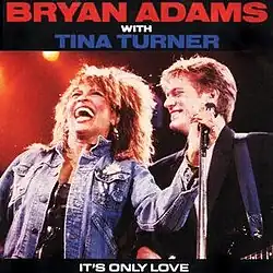 "It's Only Love" is a song by Canadian singer and songwriter Bryan Adams, featuring American singer Tina Turner. Released as a single on October 25, 1985, the song was nominated for a Grammy Award for Best Rock Performance by a Duo or Group with Vocal and the accompanying video won an MTV Video Music Award for Best Stage Performance.[4] It was the sixth and final single from Adams' album Reckless (1984) and was included on Tina Turner's live album Tina Live in Europe (1988), as well as being added to both artists' greatest hits compilations: Adams' Anthology (2005) and Turner's All the Best (2004). It reached number 15 in January 1986 on the Billboard Hot 100[5] in the United States and number 29 in the United Kingdom. The 12-inch single included the 1985 live version that would later appear on the album Tina Live in Europe (1988).