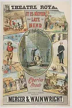 It Is Never Too Late to Mend (sometimes written as It's Never Too Late to Mend) is an 1856 novel by the British writer Charles Reade. It was later turned into a play. A ruthless squire becomes obsessed with a younger woman and conspires to have her lover framed and sent to jail.