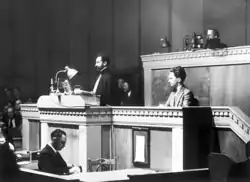 On 12 May 1936, the League of Nations allowed Selassie to address the assembly. Selassie was introduced as "His Imperial Majesty, the Emperor of Ethiopia" (French: Sa Majesté Imperiale, l'Empereur d'Éthiopie), to jeering and whistling by Italian journalists.[47] The Romanian delegate Nicolae Titulescu shouted "To the door with the savages!" (Romanian: A la porte les sauvages!), and the journalists were removed from the hall. Selassie responded with a speech.[48][49][50][51] In a speech on 30 June 1936 to the assembly, he predicted "It is us today, it will be you tomorrow" if the League of Nations permitted Italian aggression.[12] Mussolini grew frustrated over the continued recognition of Selassie by the League of Nations and on 11 December 1937 announced the withdrawal of Italy's delegation to the League.[52]