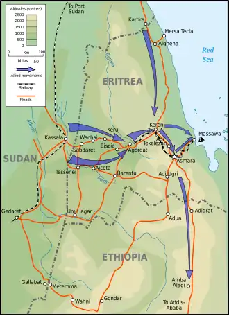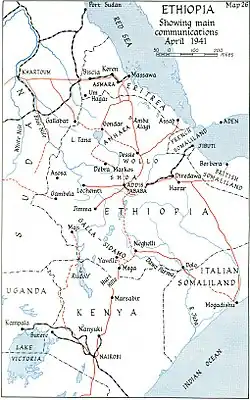 Hostilities began on 13 June 1940, with an Italian air raid on the base of 1 Squadron Southern Rhodesian Air Force (237 (Rhodesia) Squadron RAF) at Wajir in the East Africa Protectorate (Kenya). In August 1940, the protectorate of British Somaliland was occupied by Italian forces and absorbed into Italian East Africa, which lasted around six months.[54] Anthony Eden, the Secretary of State for War, convened a conference in Khartoum at the end of October 1940 with Selassie, South African Prime Minister Jan Smuts, Wavell, Lieutenant-General William Platt and Lieutenant-General Alan Cunningham. A plan to attack Italian East Africa, including support for Ethiopian resistance forces, was agreed.[55] General Wavell, commander of British troops in the Middle East, charged Colonel Sandford to make plans to aid and mobilize the Ethiopian patriots.[56][57]