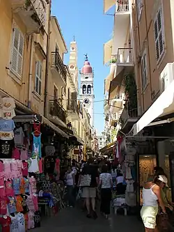Corfiot Italians (or "Corfiote Italians") are a population from the Greek island of Corfu (Kerkyra) with ethnic and linguistic ties to the Republic of Venice. The origins of the Corfiot Italian community can be found in the expansion of the Italian States toward the Balkans during and after the Crusades. In the 12th century, the Kingdom of Naples sent some Italian families to Corfu to rule the island. From the Fourth Crusade of 1204 onwards, the Republic of Venice sent many Italian families to Corfu. These families brought the Italian language of the Middle Ages to the island.[38] When Venice ruled Corfu and the Ionian islands, which lasted during the Renaissance and until the late 18th century, most of the Corfiote upper classes spoke Italian (or specifically Venetian in many cases), but the mass of people remained Greek ethnically, linguistically, and religiously before and after the Ottoman sieges of the 16th century. Corfiot Italians were mainly concentrated in the city of Corfu, which was called "Città di Corfu" by the Venetians. More than half of the population of Corfu city in the 18th century spoke the Venetian language.[39] The re-emergence of Greek nationalism, after the Napoleonic era, contributed to the gradual disappearance of the Corfiot Italians. Corfu was ultimately incorporated into the Kingdom of Greece in 1864. The Greek government abolished all Italian schools in the Ionian islands in 1870, and as a consequence, by the 1940s there were only 400 Corfiote Italians left.[40] The architecture of Corfu City still reflects its long Venetian heritage, with its multi-storied buildings, its spacious squares such as the popular "Spianada" and the narrow cobblestone alleys known as "Kantounia".