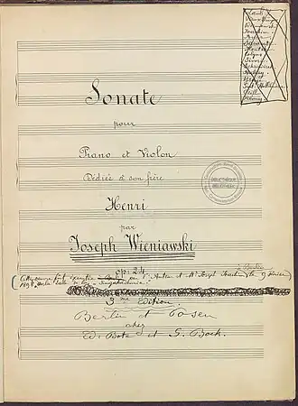 - ^ The upper right hand corner mentions the names of the different interpreters of this sonata: « Laub, Vieuxtemps, Wieniawski, Joachim, Auer, Sarasate, Kontski, Colyns, Sivori, Schradieck, Hubay, Ysaÿe, Gust, Hollaender, Prill, Rémy ».