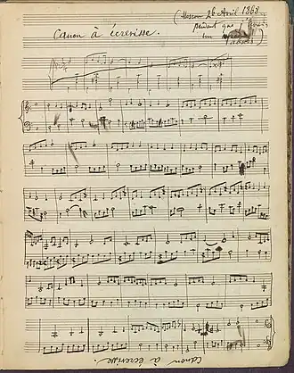 These 38 pieces – sketches, autograph manuscripts or copies – with non-negligible historical value and of which some were never published,[1] often include marks revealing the composer's creative process. They not only shed light on the individuality of the musician, but also on the environment in which he evolved, as well as on the interpretation practices of the 19th century. His annotated Piano Concerto op. 20, vowed to the Leopold II of Belgium, his mazurkas, marches, chants created for some European high society personalities or musicians such as Rossini and Saint-Saëns, or even his Sonata for violin and piano op. 24, dedicated to his brother Henryk and « executed by the Author and Mr. Joseph Joachim in the Berliner Singakademie[2] on February 9th » are eloquent proofs in this regard. In his Canon à écrevisse pendant que j'avais un abscès,[3] he cries out his occasional ill-being with a moving touch.