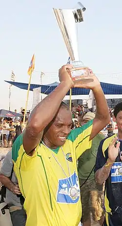 In 1993, aged 29, Júnior Negão was invited to play for the newly formed Brazil beach soccer team, to complement aging former football stars also comprising the team such as Paulo Sérgio, Júnior (from whom his nickname was derived),[15] Cláudio Adão and Edinho;[5] the latter claimed he "bet everything" on mentoring Júnior Negão with the belief he would be a success.[16] He would go on to represent Brazil from the team's maiden international match against the United States (notably scoring Brazil's first ever goal), until his retirement in 2008 aged 44,[13] during which time he won over 40 trophies with the team.[9] By 1998, he was already on the verge of scoring 100 goals for Brazil,[17] and now ranks second for Brazil in terms of most goals scored and third in terms of most games played, with over 300 each.[10] He was world champion on 12 occasions (nine World Championships and three FIFA World Cups;[12] he is the third top scorer in the history of the former, and won the latter as Brazil's captain[5]). After making his landmark 300th appearance for Brazil in December 2007,[18] he initially planned to retire after the 2008 World Cup final against Italy,[11][13] but actually ended-up participating in that year's Mundialito the next month,[19][20] eventually playing his final match in December of that year, a testimonial to his 15-year career.[21]