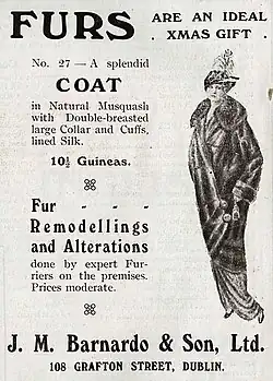 Furrier John Michael[is] Barnardo opened his fur business in 1812 at 4 Dame Street, next to Dublin Castle. A register of residents from 1870 also gives the address of 36 Mary Street for the Lord Lieutenant's furrier, Henry Barnardo.[3][1] A business directory of 1874 contains two Dublin retail furriers, B. Barnardo here addressing 78 Argyle Street.[4]