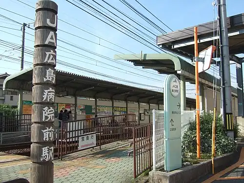 JA Hiroshimabyoin-mae is a Hiroden station on Hiroden Miyajima Line, located in front of JA Hiroshima Kōseiren Hiroshima General Hospital, in Jigozen, Hatsukaichi, Hiroshima.[1]
