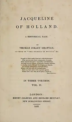 Jacqueline of Holland is an 1831 historical novel by the Irish writer Thomas Colley Grattan, published in three volumes.[1] It depicts the life of Jacqueline, Countess of Hainaut, the early fifteenth century ruler of much of the Low Countries. Amongst the other characters who feature is Humphrey, Duke of Gloucester, the brother of Henry V of England. Grattan had enjoyed success with another historical novel set in the region The Heiress of Bruges the previous year, and both books drew inspiration from the works of Walter Scott. Grattan dedicated the book to his friend, the Irish military doctor Arthur Brooke Faulkner.[2]