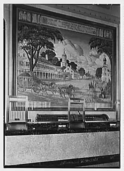 The interior western wall featured a 16'x25' mural of 19th century Fulton Street with a stagecoach and wide street that was removed by Capital One Bank in 2011.