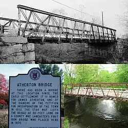 ATHERTON BRIDGE There has been a bridge at this location since early settlement. It is named for James Atherton, one of the signers of the petition for incorporation of the town in 1652. The 1794 map lists the bridge as 90 feet long on a county way Lancaster’s first iron bridge was placed here in 1870.