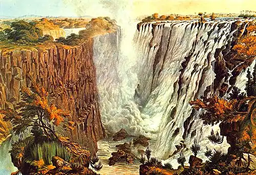 By 1854 he had teamed up with Samuel H. Edwards, another explorer, and launched an expedition to Lake Ngami after which he trekked through the territory between Northern Bechuanaland and the Zambesi. An easygoing man, he was able to get on with the Bushman hunters of the semi-desert interior and spent long periods in their company, obtaining valuable help from them. Returning to Ngami, he travelled north to the Okavango River, crossing Damaraland and reaching Walvis Bay. Here he busied himself with cattle-trading in Damaraland, before setting out on an expedition with his brother Henry and Thomas Baines and lasting from December 1860 to September 1864. Their aim was to explore the Zambesi from the Victoria Falls down to its delta, with a view to testing its navigability. However, these plans were bedevilled by sickness and misfortune. They did reach the Zambesi, but did not get to explore the mouth. On 23 July 1862 they reached the Victoria Falls. It was on this expedition that Baines painted many of his famous scenes which were reproduced in an album of prints. His attempt at exploring the Zambesi ruined his health and exhausted his finances. He returned to Cape Town in 1864, dispirited and fever-stricken. The expedition was notable since it was the first time that a stereoscopic camera had been used to record its progress. The size of the negatives was about 6 x 4.5 inches and of rather poor quality. Prints of these photographs are at the Africana Museum in Johannesburg.