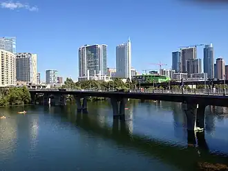 The James D. Pfluger Pedestrian and Bicycle Bridge is a shared use bridge for pedestrians and cyclists spanning Lady Bird Lake in downtown Austin, Texas. Opened in 2001, the bridge connects the north and south sides of the Ann and Roy Butler Hike-and-Bike Trail and features an unusual "double curve" design. The bridge runs parallel to the Lamar Boulevard Bridge, which carries road traffic across the lake roughly 200 feet (61 m) to the west.[1]