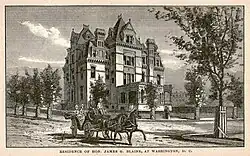 With the help of money earned from his book, Twenty Years of Congress, Blaine chose John Fraser (1825–1906) to design his home.[11][13] Fraser was a Scottish-born architect who emigrated to the United States in 1845. During his 50-year career, Fraser designed several prominent buildings in Pennsylvania and later Washington, D.C., where he opened a practice in 1871. He continued his practice in the city until around 1890 when he returned to Philadelphia. During his time in Washington, D.C., Fraser designed the Brodhead-Bell-Morton Mansion, the British Legation (demolished), the St. John's Episcopal Church rectory, Kann's Department Store (demolished), two fire stations (both demolished), and prominent houses in the present-day Greater Fourteenth Street Historic District, Greater U Street Historic District, and Sixteenth Street Historic District. The Blaine Mansion is Fraser's best known design in Washington, D.C.[11][14] Construction of the Blaine Mansion began in 1881 at a cost of $90,000.[15] The family moved into their new residence in December 1882.[11]