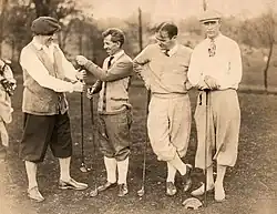 Members of the Knot-Very Social and Musical Frat prepare to play golf in the 1910s. Among them is James J. Montague, second from left, and Ring Lardner, on the right.