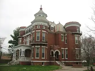 The James Robert Williams House is a historic house located at 310 E. Main St. in Carmi, Illinois. The house was built in 1896 for James Robert Williams, a U.S. Representative and political ally of William Jennings Bryan. Prominent residential architect George Franklin Barber designed the red brick house in a blend of the Romanesque Revival and Queen Anne styles. The house has three corner towers, two with crenellated tops and one with a double bell roof; the towers cause the building to resemble a castle. The house's front entrance is surrounded by an arched porch with a balcony on its roof. A loggia is located above the entrance on the house's third level.[2]