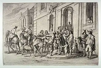Jan Baptist de Wael was born in a painting family in Antwerp. His grandfather was the painter Jan or Jan Baptist de Wael who had been included by Anthony van Dyck in his "Iconography" (Icones Principum Virorum), a collection of portraits of leading personalities in van Dyck's time. Jan Baptist the Younger's father was Lucas de Wael.[1] Lucas de Wael was not only a painter and engraver but also a dealer in art and luxury goods and had spent years in Italy, in particular Genoa, with his brother Cornelis de Wael. After Lucas had returned to Antwerp, Lucas and Cornelis, who had remained in Genoa, established a lucrative business trading in art and luxury items between Italy and Flanders. In Genoa, Cornelis' workshop was the centre of the colony of Flemish artists who resided in or passed through the city. Cornelis assisted them with their local integration, passed on recommendations to clients and formulated competition rules. When Anthony van Dyck visited Genoa, he had stayed with the brothers and Cornelis was one of his closest collaborators in the city.[2]