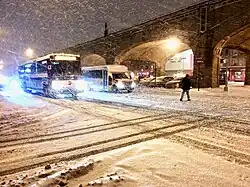 The metro regions of New York were also put under a state of emergency by governor Andrew Cuomo, who advised residents in the affected cities, specifically New York City to hunker down and avoid travel.[8] Mayor Bill de Blasio activated emergency preparations and implemented alternate-side parking rules,[15] while approximately 1,700 snow plows were mobilized to clear snow from roadways.[16] Despite forecasts of heavy snow, the Broadway theatre remained open on January 21.[17] New York City received approximately 11.2 inches (28 cm) of snow from the blizzard, with slightly higher totals in the suburban areas of the city.[13]