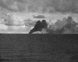 Chiyoda was crippled by four bombs dropped by aircraft from the carriers USS Franklin and USS Lexington that left her dead in the water. The converted hybrid battleship-carrier Hyūga attempted to take her in tow, but was prevented by a third attack. The cruiser Isuzu was ordered to remove Chiyoda's crew, but this was also frustrated due to continuing danger from air and surface attack. After three attempts, Isuzu was forced to retreat with U.S. surface forces in sight and Chiyoda under naval gunfire.[3] She was finished off by gunfire from four cruisers, USS Santa Fe, Mobile, Wichita and New Orleans,[5] along with nine destroyers, all under the command of Rear Admiral Laurence DuBose.[3][6] No survivors were permitted to be rescued,[7] and Captain Jō Eiichirō and the entire crew of 1,470 officers and men went down with the ship at position 19°20′N 126°20′E / 19.333°N 126.333°E. Chiyoda was removed from the navy list on 20 December 1944.[3]