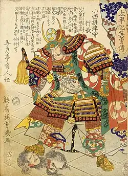 At the core of the Japanese military were the samurai, the military caste of Japan who dominated Japanese society.[89] The standard samurai weapon by 1592 was the yari, a spear meant to stab, often with a cross-blade that allowed a samurai to pull his opponent from his horse.[89] If a samurai wished to cut his opponent rather than stab, the weapons were the ōdachi, an extremely long sword with a huge handle, or the naginata, a polearm with very sharp curved blade.[89] The most famous of all the samurai weapons was the katana, a sword described by British military historian Stephen Turnbull as "...the finest edged weapon in the history of warfare".[89] Samurai never carried shields, with the katana being used to deflect blows.[89] By 1592, the armor of the samurai was lamellae made from iron or leather scales tied together which had been modified to include solid plate to help protect the samurai from bullets.[89] Samurai on horseback would often dismount when engaged in action, acting as mounted infantry. While specialized firearms were used on horseback, most cavalrymen preferred the yari,[90] but its use was limited by the increasing use of firearms by the Koreans and Chinese.[91] Samurai engaged in psychological warfare by wearing iron masks into battle with a mustache made of horsehair and a "sinister grin" illustrated.[92]