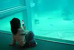 A young girl taking photos with her phone at the Osaka Aquarium in 2006