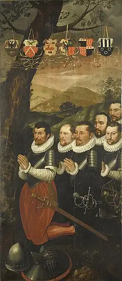 Van Liauckema (fourth from the left) together with leader Jean Baptiste de Tassis (red trousers) and brother-in-law Tiete van Cammingha (third from the left) on an altarpiece from Huissen dating from 1586