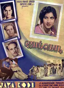 Jayakodi is a 1940 Indian Tamil-language social problem film directed by Bhagwan Dada. The film stars K. T. Rukmini and K. Natarajan. It revolves around a girl who rebels against the dowry system. The film was released on 17 March 1940 and became a success. No print of it is known to survive, making it a lost film.