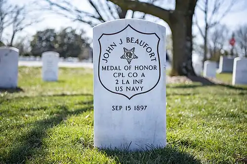 Thirty four years later, Beaufort was awarded the Medal of Honor for leading the assault on the signal station. He died some two months later on September 15, 1897, and was buried at Arlington National Cemetery, in Arlington, Virginia.[3]