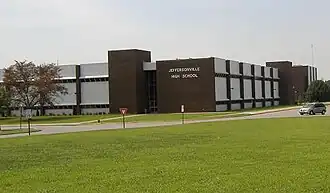 Jeffersonville High School is a public high school located in Jeffersonville, Indiana, United States. The school serves students in grades 9 through 12 from Jeffersonville, Utica, and sections of Clarksville not covered by that town's own high school. The school's enrollment for the 2014–2015 school year was 2,051 students, with 123 teachers.[3] The current principal is Pam Hall.[4] Jeffersonville is in the school district of Greater Clark County Schools. This school district includes Charlestown addresses that are connected with the city of Jeffersonville. While most schools in other counties have a majority European ratio of students, Jeffersonville total minority enrollment is 36%.[5]