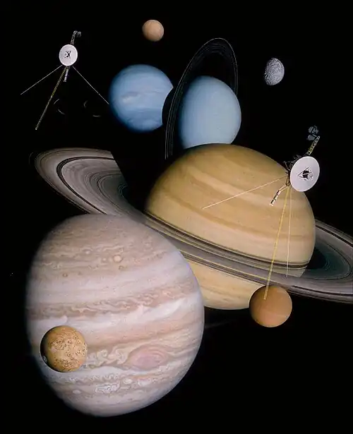 Initially set on a trajectory to explore Jupiter and its moon Io, Voyager 1's mission parameters were adjusted to also provide a close flyby of Saturn's moon Titan.[26] The spacecraft sent back detailed images and data from both gas giants, revolutionizing the understanding of these distant worlds.[27] The Voyager 2 spacecraft followed a more extensive trajectory, conducting flybys of not just Jupiter and Saturn, but also Uranus and Neptune.[28] These encounters provided firsthand data from all four gas giants, offering insights into the nature and dynamics of the outer planets. Both Voyager spacecraft, after fulfilling their primary mission objectives, were directed towards interstellar space, carrying with them the Golden Records – phonograph discs containing sounds and images selected to portray the diversity of life on Earth.[29]