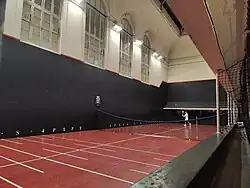 In 1927, in an attempt to broaden the membership and appeal to British and American visiting players, the club renovated the northern court into four squash courts, one offset slightly due to the presence of the tambour on the old real tennis court.[9] The remaining space has since been converted into a gym and additional changing facilities. The addition of the squash courts triggered the club to add "et rackets" to its name.[10]