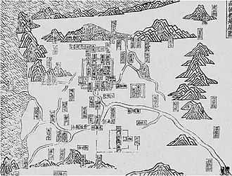 Renamed Jiankang in 313 CE, it served as the capital of the Eastern Jin, following the retreat from the north due to Xiongnu raids.[1] Jiankang remained the capital of the Southern Dynasties: Liu Song (420–479), Southern Qi (479–502), Liang (502–557) and Chen (557–589). It rivaled Luoyang in population and commercial activity, and at its height, in the sixth century, it was home to around one million people.[2] In 549 CE, during the rebellion of Hou Jing, Jiankang was captured after a year-long siege that devastated the city: most of the population were killed or starved to death. During the reunification under the Sui dynasty it was almost completely destroyed, and was renamed Jiangzhou (蔣州) and then Danyang Commandery (丹陽郡). Under the Tang dynasty, the city regained its prosperity and the name became Jinling (金陵). Jinling was the capital of the Southern Tang from 937 to 975.