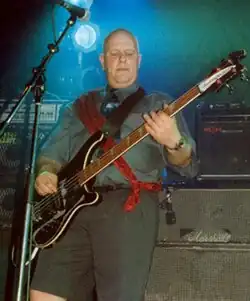 James A. "Jim" Smith[1][2][3][4] was born in Carshalton, Surrey on 14 April 1958.[5] He grew up in a Chessington house with his mother Eileen and his younger brother Tim who was born three years later.[6] Eileen was a dinner lady at the primary school Jim attended with Tim.[7] Their father Ernie, a jazz trumpeter in a swing dance band, died suddenly when Jim was six.[8] Jim purchased an electric bass to play a blues riff in around 1972 and played with Tim on snare drum according to the official Cardiacs history. They attended Fleetwood Secondary School in Chessington, Surrey, with future Cardiacs members Colvin Mayers, Mark Cawthra and Peter Tagg.[9][10] Tim briefly played bass in his first guitar experiments, before the task was passed to Jim.[11]