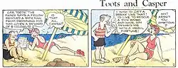 The same month he dropped Doc Attaboy, he began Toots and Casper for the American, using his wife, Matilda Katherine Crane Murphy, as the model for Toots. The strip was picked up by King Features Syndicate in 1919, and by 1925, it was being carried in numerous newspapers. He left New York and moved to California, living for decades in Beverly Hills. His hobbies of motoring and golf often interfered with his deadlines, and his business records from the 1930s revealed that he often was so late that he shipped strips east by air express. The daily Toots and Casper ran until 1951, with the Sunday strip continuing until 1956.[1]
