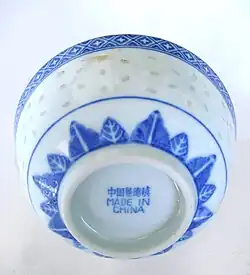 Jingdezhen porcelain (Chinese: 景德镇陶瓷) is Chinese porcelain produced in or near Jingdezhen in Jiangxi province in southern China. Jingdezhen may have produced pottery as early as the sixth century CE, though it is named after the reign name of Emperor Zhenzong, in whose reign it became a major kiln site, around 1004. By the 14th century it had become the largest centre of production of Chinese porcelain, which it has remained, increasing its dominance in subsequent centuries.[1] From the Ming period onwards, official kilns in Jingdezhen were controlled by the emperor, making imperial porcelain in large quantity for the court and the emperor to give as gifts.
