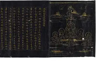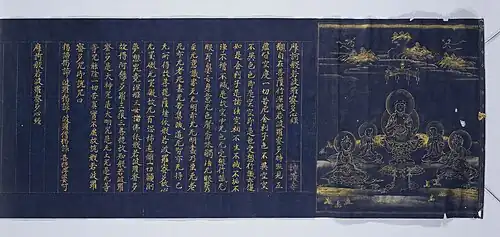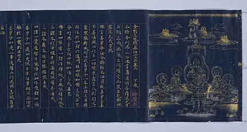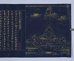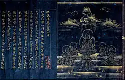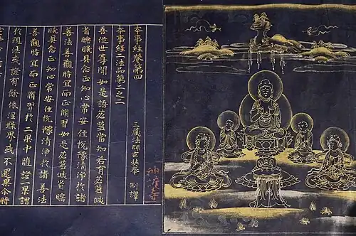 The Jingo-ji Tripiṭaka is a Japanese collection of the Tripiṭaka (Chinese Buddhist canon) composed of over 5400 scrolls made of Indigo dyed paper, and written in golden ink. Created in the twilight of the Heian period, throughout the Genpei War, the compilation of the canon was commissioned by Emperor Toba and Emperor Go-Shirakawa from 1150-1185. The scrolls were then deposited in Jingo-ji, Ukyō-ku, Kyoto. In the years since, 2317 scrolls remained with the temple while many others have been scattered into private collections and museums around the world.[1][2][3]
