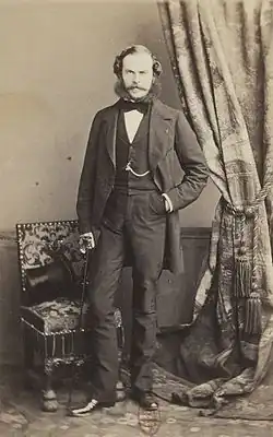 Joachim Joseph André Murat, Count Murat, was born on 12 December 1828 in Paris.[1] His parents were Pierre Gaétan Murat (1798–1847) and Marie Pauline de Méneval (1810–1889).[2] He was the grand nephew of Napoleon's marshal and brother in law Joachim Murat, the King of Naples.[3] On 17 November 1854 he married Blanche Alix Marion (c. 1835–1864). They had two children, Jeanne Pauline Caroline and Joachim. On 11 October 1866 he married Marguerite Barrot (1844–1937).[2] He second wife was the daughter of the senator Adolphe Barrot.[3] They had two children, Clothilde and Napoléone Louise Eugénie.[2]