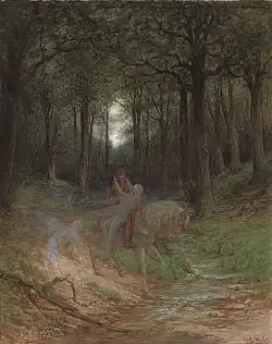 In spite of his studies under various masters in Frankfurt and Berlin, his art has little in common with modern ideas, and is formed partly by his early impressions of the simple idyllic life of his native district, partly by his sympathy with the early German masters. In his love of the details of nature, in his precise (though by no means faultless) drawing of outline, and in his predilection for local coloring, he has distinct affinities with the Pre-Raphaelites.