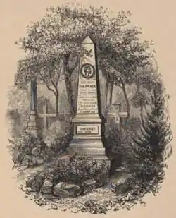 Philipp Reis was buried in the cemetery of Friedrichsdorf, and in 1878, after the introduction of the electric telephone, the members of the Physical Society of Frankfurt erected an obelisk of red sandstone bearing a medallion portrait over his grave.[11]