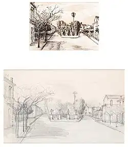 Aldridge exhibited with the 'Seven and Five Society' at the Leicester Galleries from 1931 to 1933. In 1933, he presented his first one man-show at the Leicester Galleries in London and in 1934 he exhibited at the Venice Biennale art exhibition in Italy. During this period and for the rest of his life, Aldridge associated with the British poet Robert Graves and the poets and artists centred on him in the village of Deià, Mallorca. In 1933, at age 28, Aldridge, and his cats, moved to Great Bardfield in the Essex countryside and acquired 'Place House'. He quickly became a friend of his neighbour, Edward Bawden, himself a painter. The two artists collaborated in designing ‘Bardfield’ wallpapers during the later 1930s, which were distributed by Cole & Sons, a British wallpaper company. In 1941, Aldridge joined the British Intelligence Corps as an officer interpreting aerial photographs. After leaving the army in 1945, Aldridge returned to landscape painting. Although he was a skilled 'plein air' painter, many works were produced in his studio at his home; his subjects were the Essex countryside, scenes from his many visits to Italy and to Mallorca, and his much-loved garden at Place House.