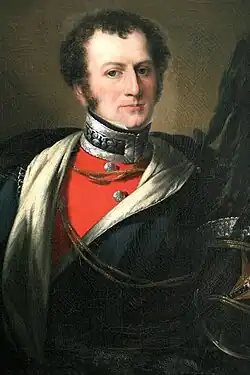 ![]() A colour picture of an 1830s painting of the fourth Earl of Tyrconnell, in the scarlet uniform of the North York Corps of Yeomanry with a hunt green cap and helmet. Around his neck is a high leather neck guard. | |