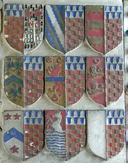 Arms of Sir John Chichester shown within a strapwork surround from his monument in Pilton Church: Chequy or and gules, a chief vair