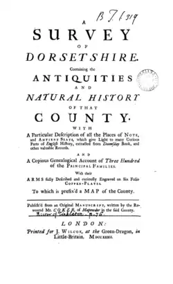 Coker was long believed to be the author of A Survey of Dorsetshire … to which is Prefix'd a Map of the County (1732), a systematic description of the history, topography, and genealogy of the county, published sometime after the author's death.[2] This was revealed to be a misattribution by county historian Rodney Legg, in an afterword to the 1980 facsimile edition of the work. The survey was, in fact, composed by Thomas Gerard (1592–1634) in the 1620s and passed on to the Coker family upon his death. Nearly a century later a London bookseller, John Wilcox, published it under John Coker's name.[1][3]