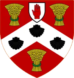 Gules on a Chevron Argent between three Garbs Or banded Vert as many Escallops Sable