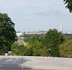 The grave was set in a plot of grass roughly 5 yards (4.6 m) on each side.[21][a] The site was about halfway up the hill on which Arlington House stands.[21][28] The grave was placed so that it had a view of the Lincoln Memorial and Washington Monument, and was aligned with them.[11] Jacqueline Kennedy lit a taper from a candle held by a nearby soldier, and then brought the eternal flame to life at the end of the burial service.[29] Kennedy's brothers, Robert and Ted, symbolically lit the flame after her.[10][29][b]