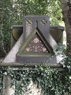 Leighton was born in 6 Devfours Place, St James Westminster, Middlesex. He remained single for the majority of his life, living in an intergenerational household and working as an artist, primarily illustrations for Book covers, working under the pseudonym Luke Limner. His talent for design found early expression in the publication Suggestions in Design ... for the Use of Artists and Art Workmen (1852). This was a work that expounded Leighton's values and beliefs with regard to the history of design. He used the ornaments and designs repeatedly in the thirty years after its publication with regard to illustrations within books, and for many hundreds of drawings for book cover designs.[2] In May 1863, he delivered a lecture On Japanese Art at The Royal Academy of Arts.[3] He is buried in the Leighton family tomb in the churchyard of St Mary's Church, Harrow on the Hill, which he designed in 1867. His tomb was listed Grade II on the National Heritage List for England in April 2016.[4]