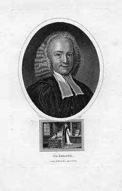 Leland was born in Wigan, Lancashire, on 18 October 1691.[1] He was educated in Dublin, Ireland and went into the ministry there. He was ordained co-pastor to Nathanael Weld (1660–1730) at New Row Presbyterian Church, Dublin, on 16 December 1716.[2] The church moved to Eustace Street, Dublin in 1728. Nathanael Weld's son Isaac (1710–1778), who was named after Nathanael's friend Sir Isaac Newton, was ordained in Eustace Street in 1732 as Leland's colleague. Isaac and Charles Weld, the writers, were the grandsons of the minister Isaac and thus the great-grandsons of Nathanael. Leland received his Doctor of Divinity degree from the University of Aberdeen in 1739.[1] His main interest was in opposing deism. He critiqued proponents of deist ideas, such as Matthew Tindal.[3]