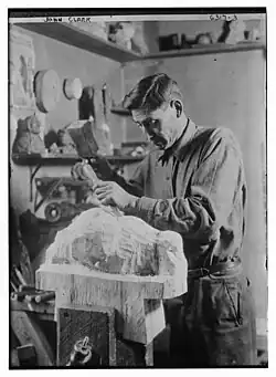 One of Clarke's sculptures was owned by Warren G. Harding and was displayed in the White House.[7] In 1924, John D. Rockefeller purchased 4 of Clarke's sculptures. In 1940, Clarke was commissioned to create a pair of relief panels. When they were completed they each weighed more than a ton, today the two panels adorn the Blackfeet Hospital lobby.[7] His work is in the collection at the Montana Historical Society[5] and the [Montana Museum of Art and Culture] at the University of Montana in Missoula, Montana.[8]
