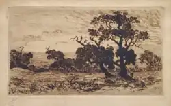 Louis Abrahams 1886 etching of an 1880 Australian pastoral landscape by John Mather. Exhibited at the First Annual Exhibition of the Australian Artists' Association. [notes 7]